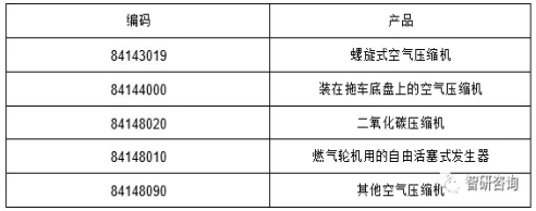 我國空氣壓縮機在海關統計沒有特定代碼統計,主要產品海關編碼如下表所示: