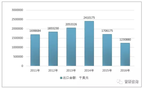 2011-2016年我國空氣壓縮機出口金額走勢圖(單位:千美元)