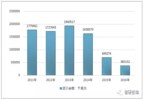 2011-2016年我國空氣壓縮機進口金額走勢圖(單位:千美元)