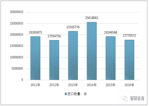 根據中國海關統計數據顯示,2016年我國空氣壓縮機進口數量為17770572臺,較2015年的19246568臺下降7.7%。